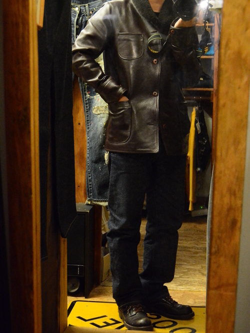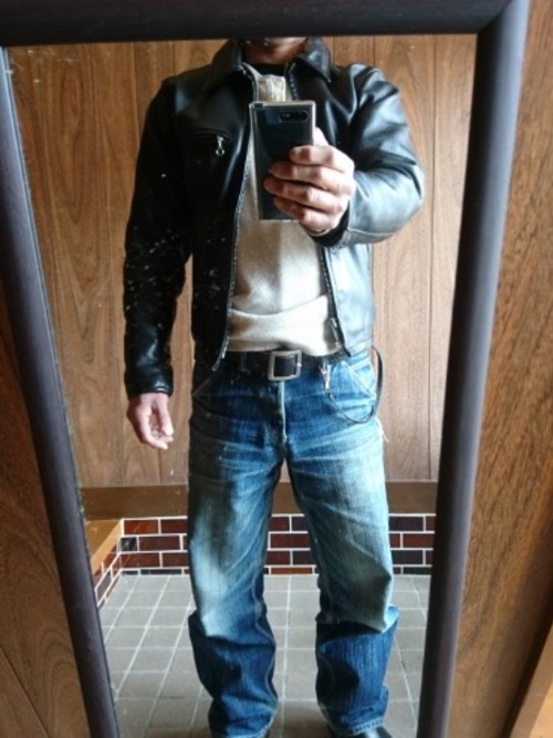 レザーのジャケットにサムライジーンズのデニムパンツというコーデ。レザージャケットもアメカジコーデで人気のアイテム。サムライジーンズのようにしっかりした生地のデニムと合わせると相性抜群です。靴もスニーカーではなくブーツを選んで全体を引き締めています。