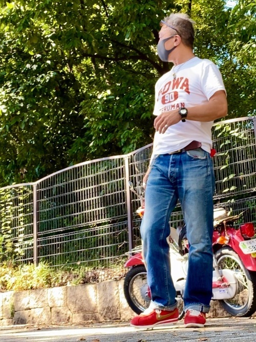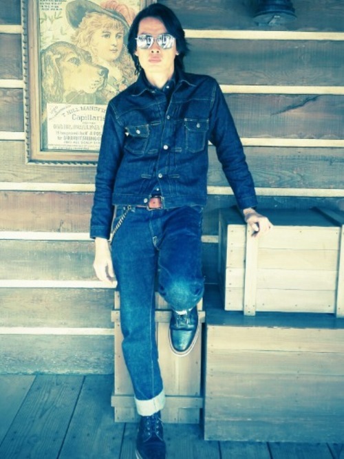 デニムとデニムを合わせるアメカジ定番のスタイル。ジャケットもパンツもサムライジーンズのデニムです。大きめのサングラスもアメカジ感をアップさせています。パンツはルーズ感のないサイズを選び、裾はロールアップにして引き締まったシルエットに。