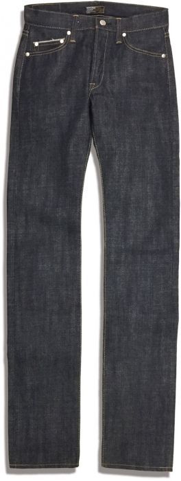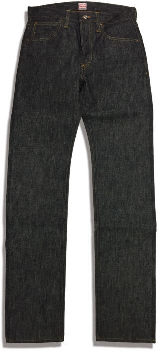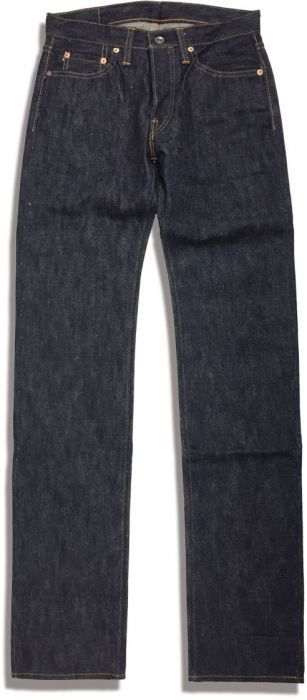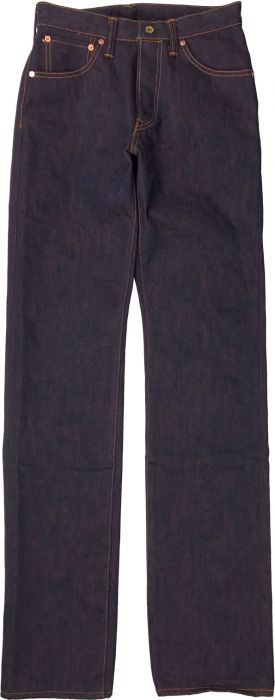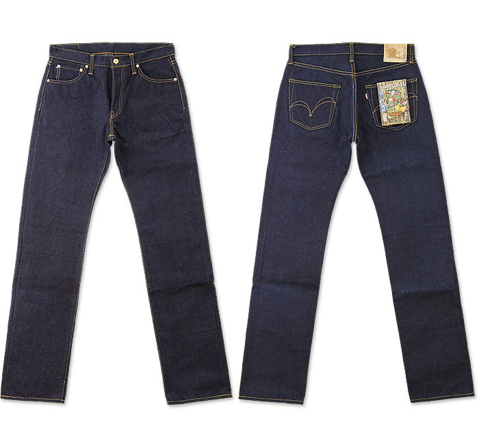 スペシャル限定ジーンズ企画「五輪之書:火の巻」。やや細身のストレート。火の巻をイメージして草木染料や顔料などで染め上げた赤系の緯糸を打ち込んであります。セルビッチは金ラメ耳。インディゴと緯糸の赤色が交わりあい独特な表情が見られます。