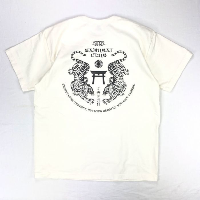 日本らしいモチーフのプリントTシャツです。高品質の原綿を使用し、14番手の太い糸をじっくりと編みたてた、オリジナルへヴィーウエイトサムライ倶楽部Tシャツシリーズ。襟周りは耐久性に優れたバインダーネック3本針仕様で、着用を繰り返しても伸びにくい特徴があります。