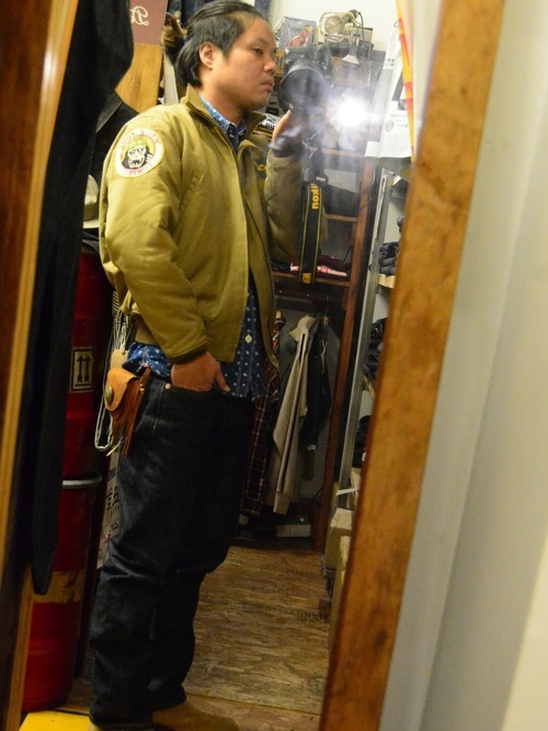 ミリタリージャケットを使ったアメカジ風コーデ。重厚感のあるヘビーオンスのデニムにミリタリージャケットは良く合います。ブラウンやブラックといった重みのある色ではなく、あえてベージュ系のブーツにしているところもポイント。