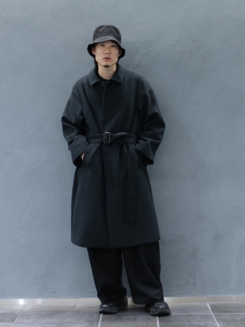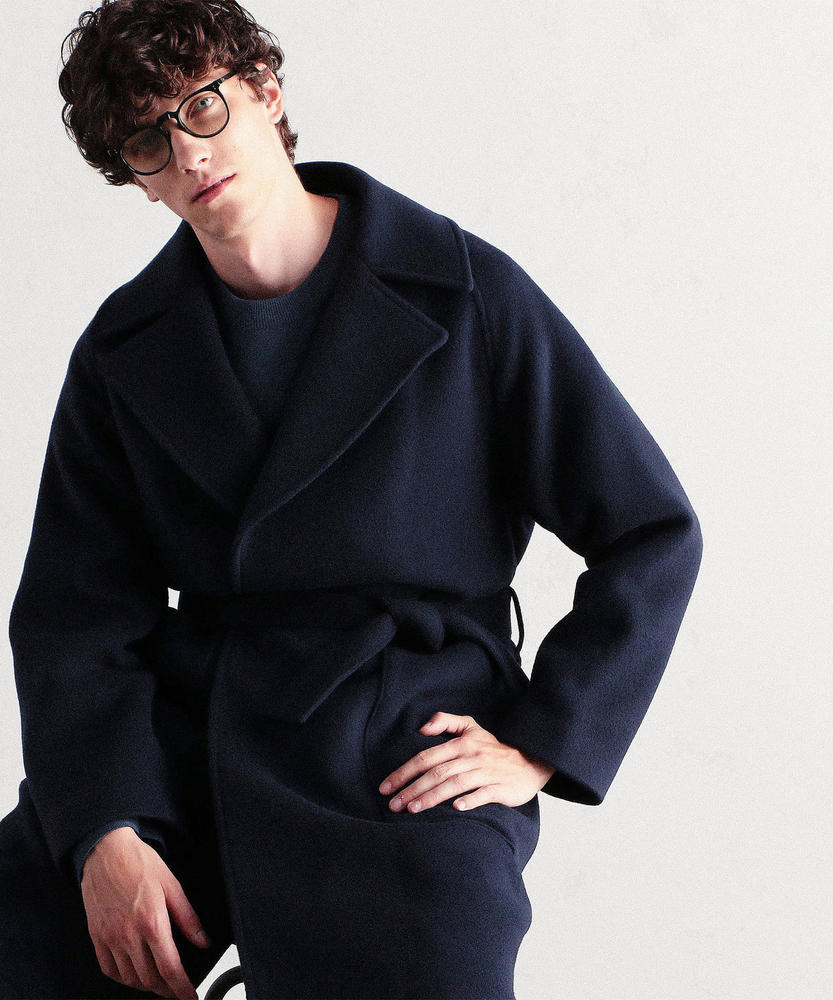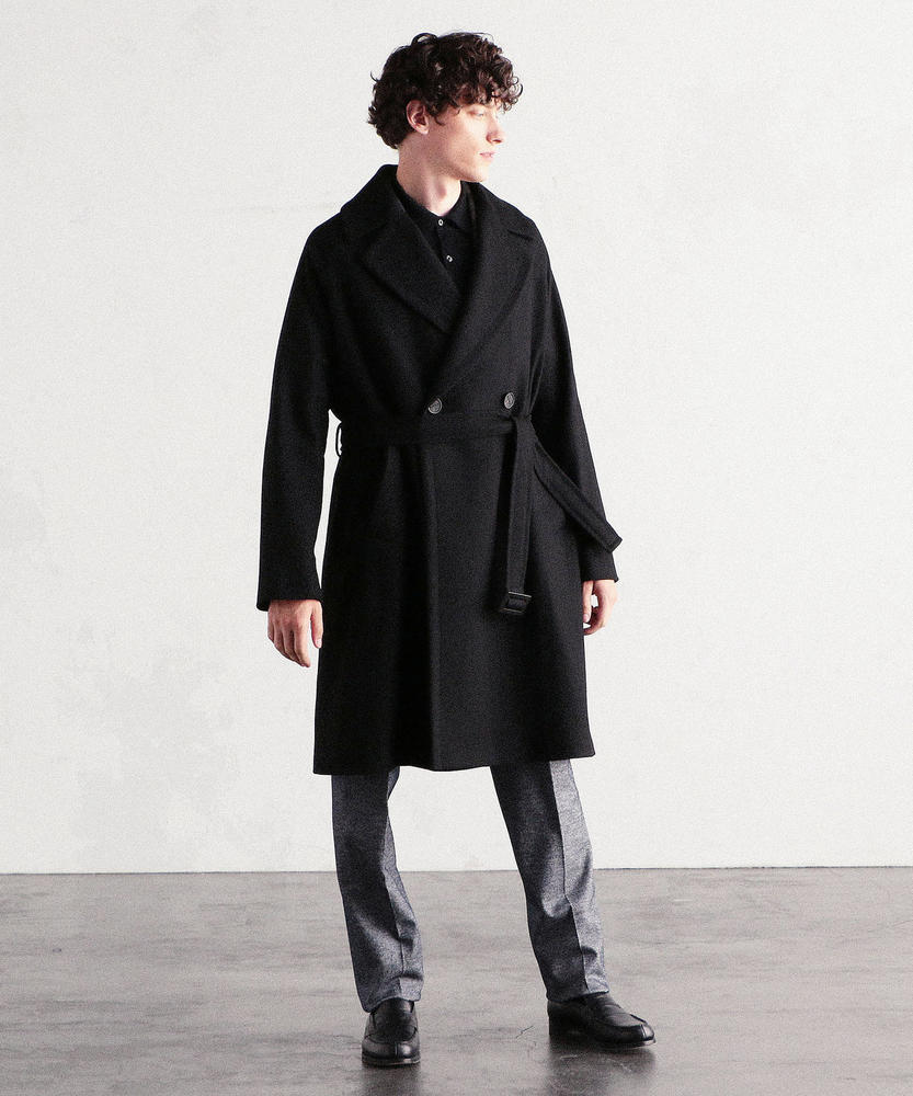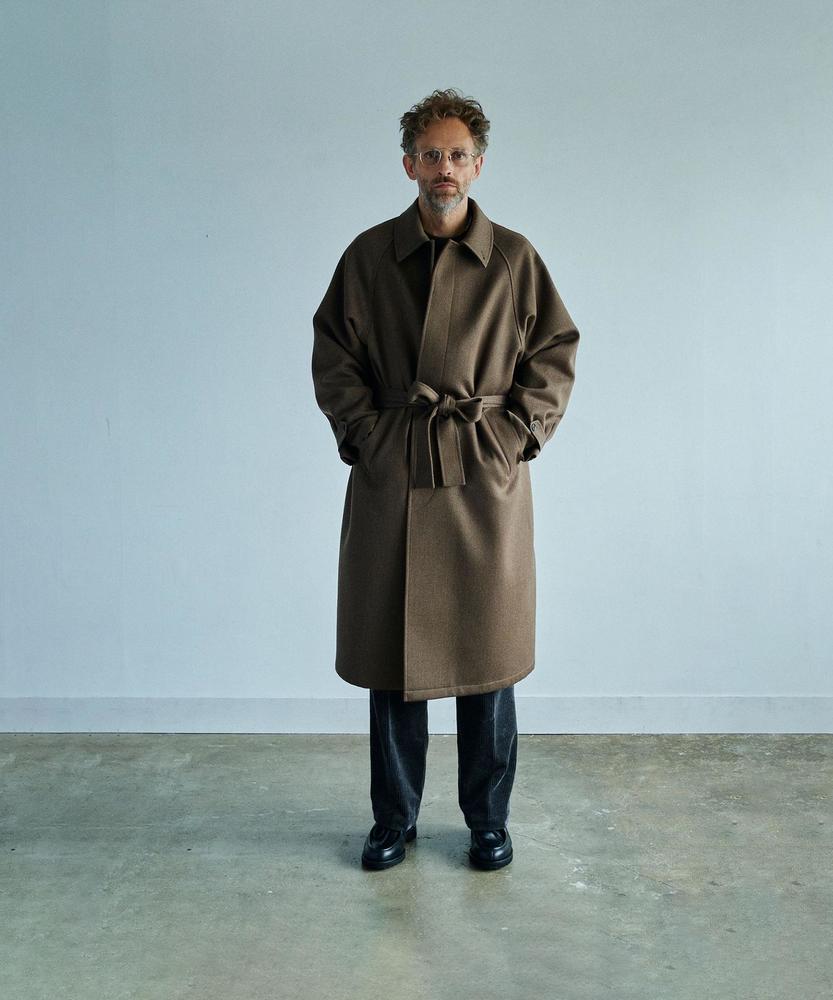 通常のメルトンコートと比較して約半分の軽さが特徴の「軽さ、暖かさ、肌触り」の三拍子そろったベルテッドコートです。セミダブルのチェスターコートデザインで、フロントはあえてボタンをつけず、裏地もつけない着流しコート。ラグランスリーブなのでインナーを着込んでも腕周りがごわつかず動きやすいのもポイントです。