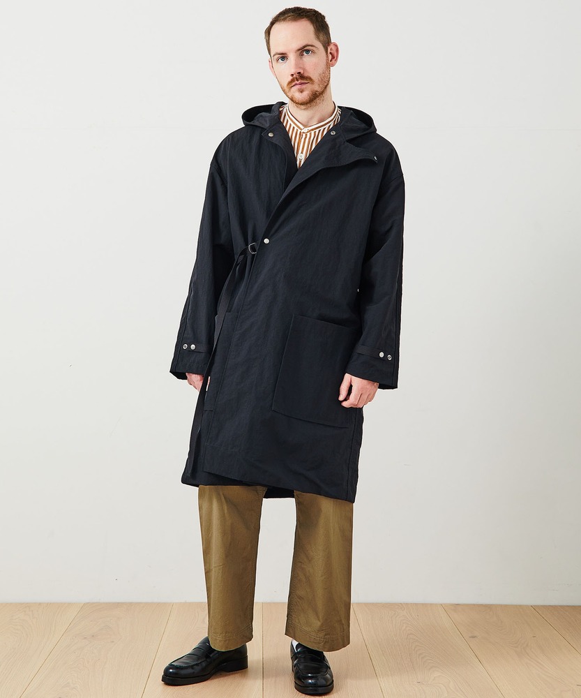 さまざまな表情を楽しめる、雰囲気のあるロングコート。タイロッケンコート のようにベルトを締めても、ベルトを外してドットボタンで前を締めても、前を開けたまま羽織ってもサマになります。撥水加工が施されたシワ感のある丈夫で軽い素材で仕立ててあるので、持ち歩き用としても便利です。