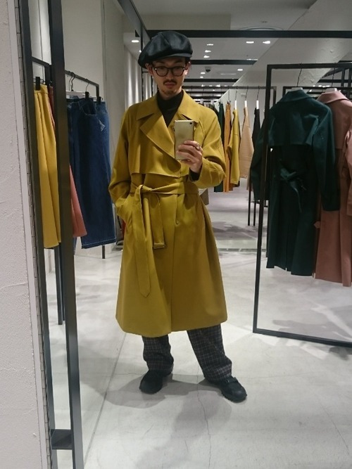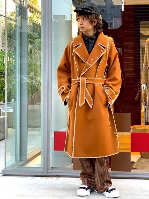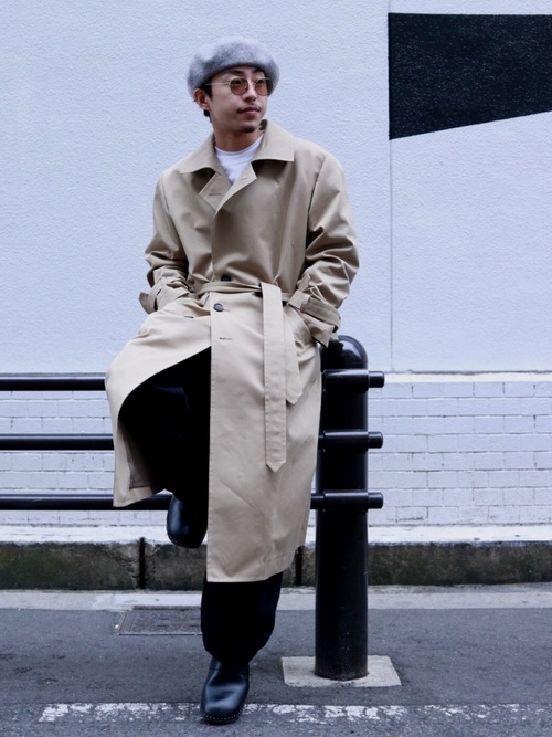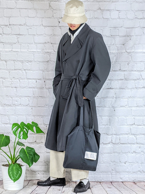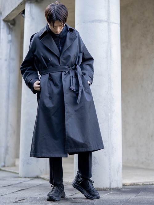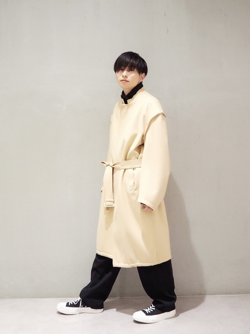 コクーンシルエットが印象的な淡いイエローのオーバーコートを使用したメンズコーデ。インナーやボトムスに濃色を配置することでコートの特徴的なシルエットがより引き立っています。足下はスニーカーで軽快さも感じさせる着こなしに。