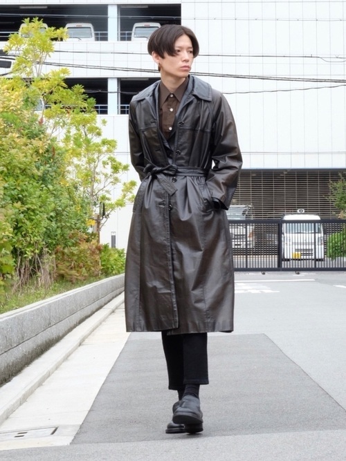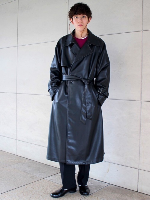 シンセティックレザーのベルテッドコートを使用したメンズコーデ。ビッグシルエットのコートが旬のムードを醸し出しています。インナーのワインレッドの差し色がレザーのハードな印象を和らげ知的な印象に。足下はスラックスときれいめのシューズでまとめて、スタイリッシュな着こなしになっています。