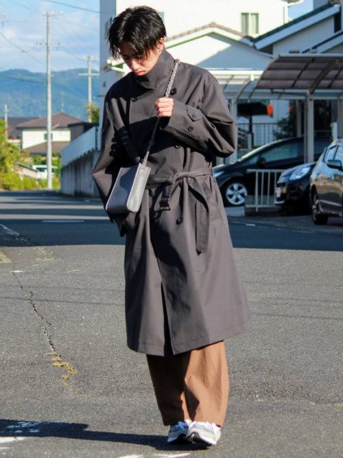 大人らしいグレーのベルテッドコートとブラウンのワイドパンツを合わせたメンズコーデ。オーバーサイズで襟を立てたコートとパンツのゆったりしたシルエットが旬のシルエットを演出しています。小さめのショルダーバッグもトレンド感のあるアクセントに。足下はスニーカーで抜け感をプラス。