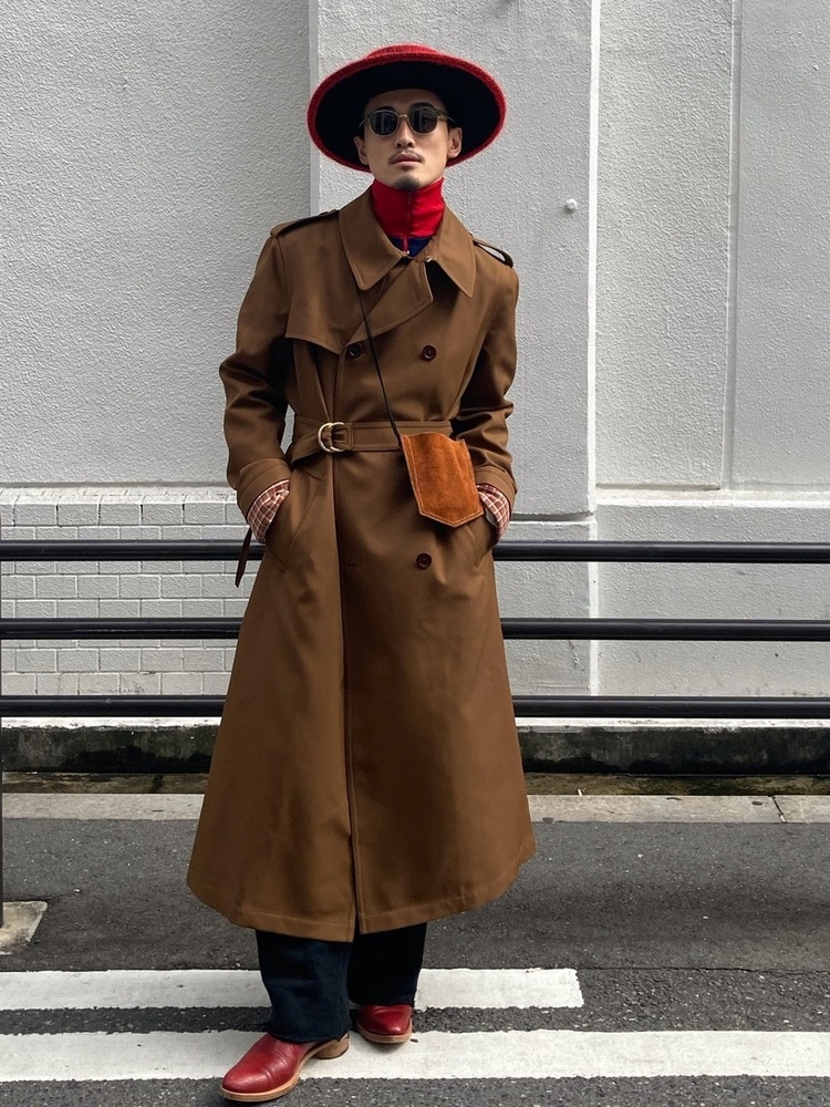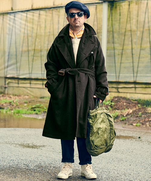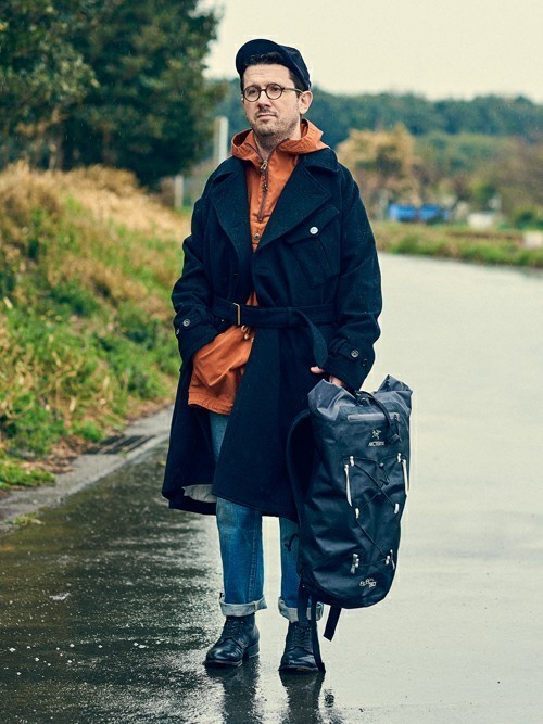 40年代の英国モーターサイクルコートをモチーフにしたベルテッドコートに、テラコッタカラーのアノラックジャケットがアクセントになったメンズコーデ。コートは前開けで着用し、あえてベルトだけ閉めカジュアルダウンすることでこなれた印象に。足下は黒のブーツで引き締め、ワーク感ときれいめのバランスが絶妙な都会的なスタイルに仕上がっています。