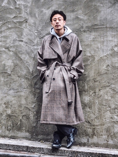 オーバーサイズでチェック柄の存在感のあるベルテッドコートをパーカーでカジュアルダウンしたきれいめスタイル。きれいめとカジュアルのバランスにこなれた感を感じる着こなしです。足下はツヤのあるシューズでエレガントに。