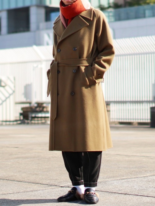 光沢感のある上質なメルトン素材のベルテッドコートと黒のツイードパンツ、ストールのウォーム感のあるメンズコーデです。スッキリした丈感のパンツが適度なカジュアル感をプラスし、軽快な印象の着こなしになっています。足下はブラウンのローファーで知的に。