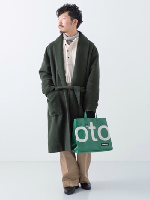 深いグリーンのガウンコートを使用したレイヤードスタイル。白、ライトグレー、ベージュの上品な色合わせのコーデにオーバーサイズのガウンコートをざっくりと羽織ることでリラックスしたムードに。ゆるく結んだベルトがメリハリをもたらしています。
