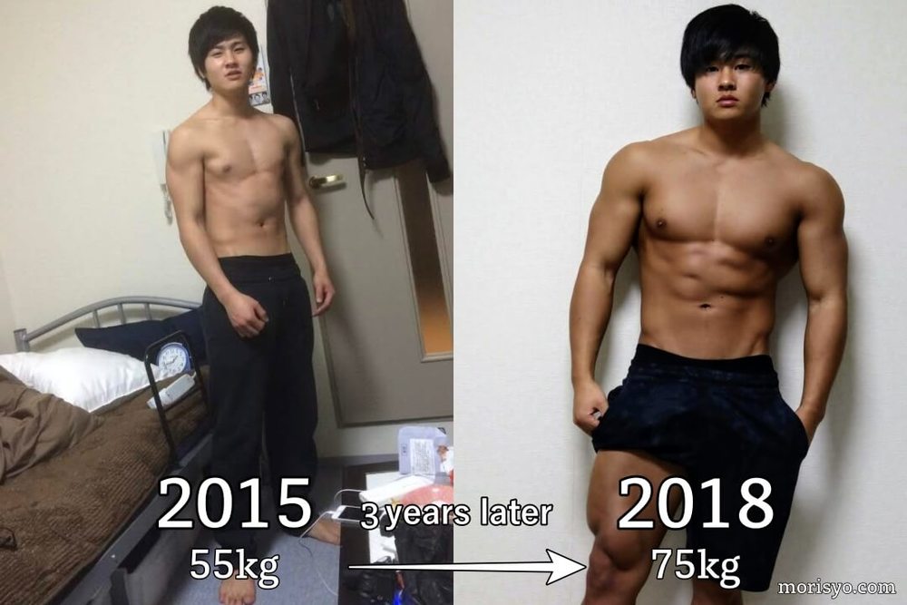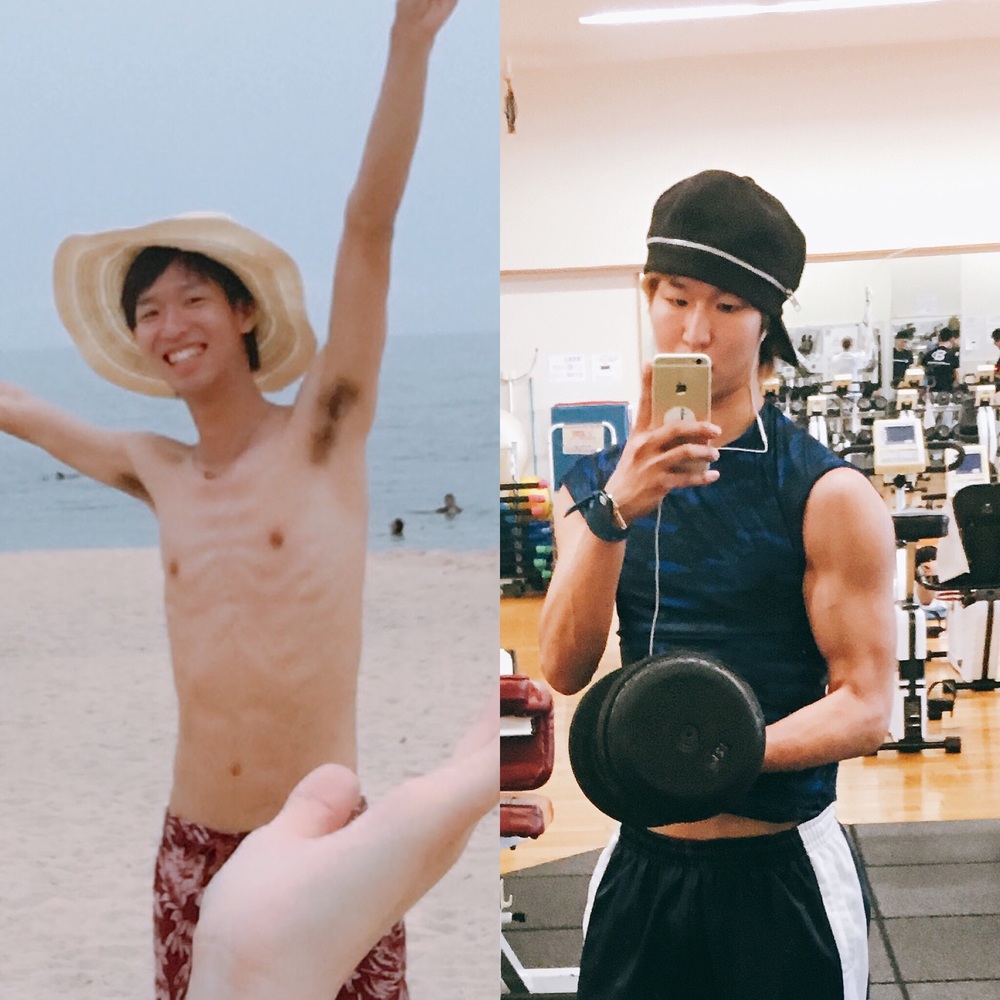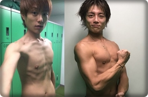 ビフォーは痛々しいくらいガリガリですが、アフターは見事に筋肉量アップです。