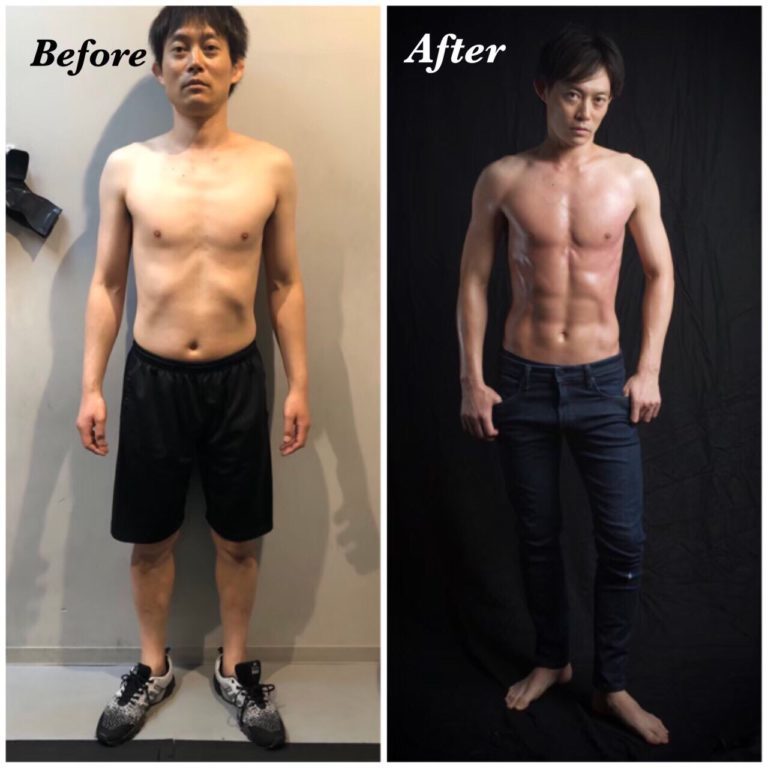 ビフォーは貧弱な身体つきですが、アフターは筋肉量も増加して見事な痩せマッチョになりました。腹筋もよく鍛えられています。