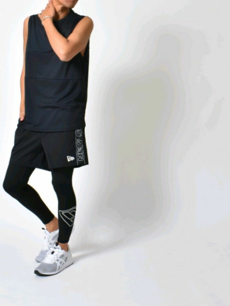 タイトなパンツと着丈が長めのタンクトップを合わせれば、ランニングをする際のメンズコーデにもこなれ感が生まれます。タンクトップの中に黒のタンクトップを重ね着し、スニーカーやキャップと色味をリンクさせていることもポイントです。胸元に入ったNIKEのロゴもメンズコーデのアクセントになっています。