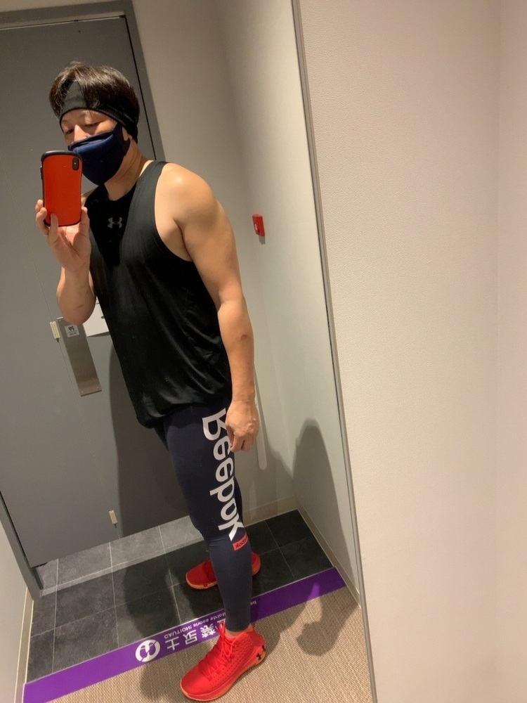 黒のランニングタンクトップに、ビビットなオレンジのレギンスを合わせた、目を引くおしゃれなメンズコーデです。レギンスにも黒が入っているため、コントラストがハッキリとしていても浮いた着こなしになりません。ソール部分がピンクのスニーカーで、地味になりがちなランニングコーデを足元から華やかな雰囲気にアップデートしている点も参考にしたいです。