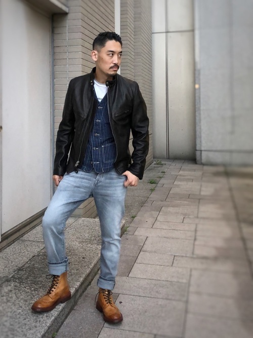 ミリタリーアイテムでゴツい印象のブーツ。デニムやシャツと合わせてカジュアルながらルードな印象のメンズコーデです。