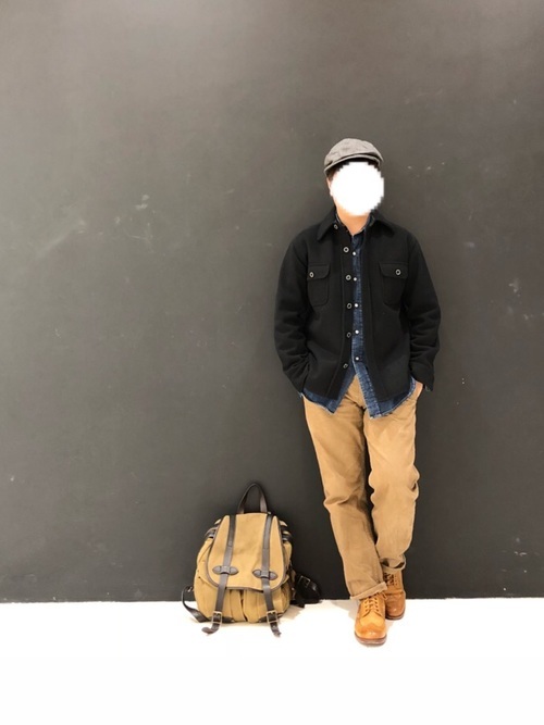 ボトムスやリュックのカラーと合わせたブーツが華やかな印象です。カジュアルな雰囲気のメンズコーデではありますがどこか洗練された印象になるのは靴がロイヤルワラント認定アイテムだからでしょう。