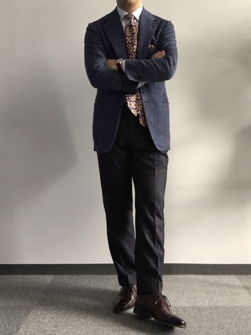 風合いが柔らかく、優雅な着こなしができるスーツジャケットを探している方におすすめなアイテムです。ノッチのついたラぺルや男性らしさが美しく際立つショルダーラインはロイヤルワラントの称号を得ているブランドならでは。ジャケットと同じく光沢のあるネクタイや上品なシャツとよくなじむでしょう。