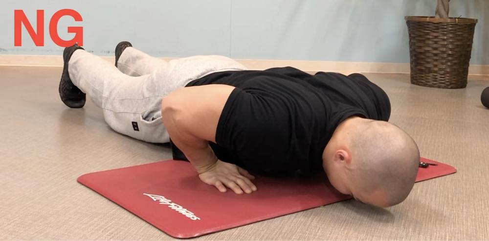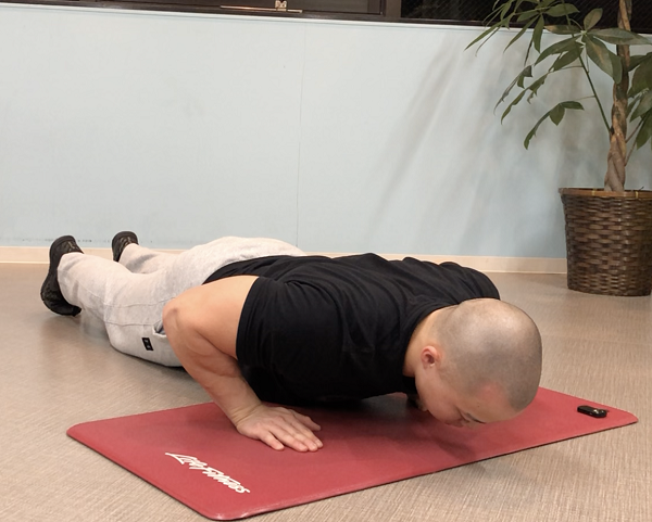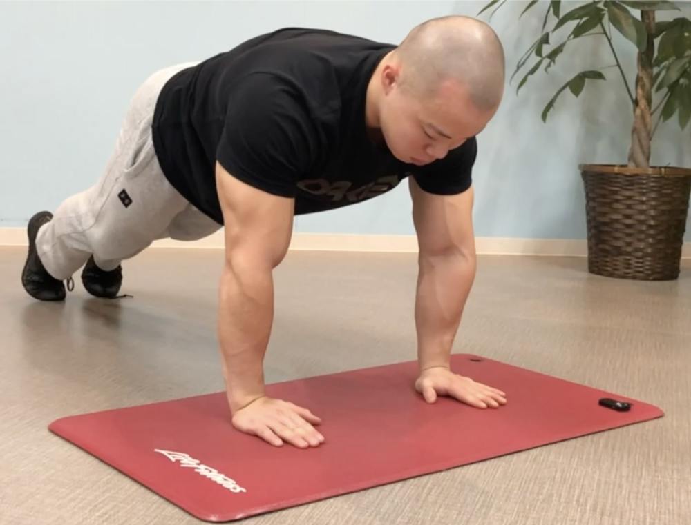 手首の痛みの予防・改善のためには、こちらの画像のように体重を手のひらの根元に乗せるかたちで動作を行うと良いでしょう。ただこの種目の性質上、動作の際に手首が反ってしまうことはどうしても避けられません。「手のひらの根元に体重を乗せても手首が痛い」という方は、プッシュアップバーを使用してみてください。