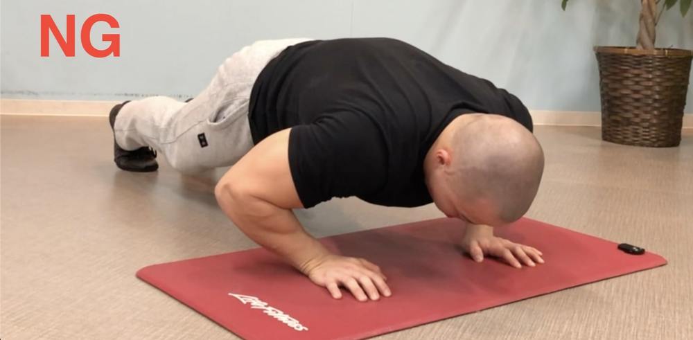 ナロープッシュアップを行う際には、体重の乗せ方に注意する必要があります。上の2枚の画像のように手のひらに体重を乗せるような状態で動作を行うと、手首が曲がったまま重さを支えるため「手首が痛い」といった問題が起こりがちです。