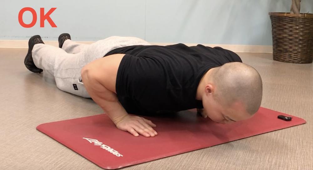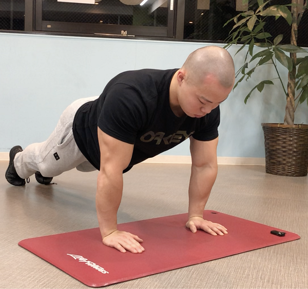 まずは、基本的な腕立て伏せの姿勢になります。横から見たときに、手・肩・足の位置関係が三角形になったフォームを作るよう意識してください。頭はまっすぐの状態にし、身体についても動作の間はまっすぐになったラインをキープできるようにしましょう。