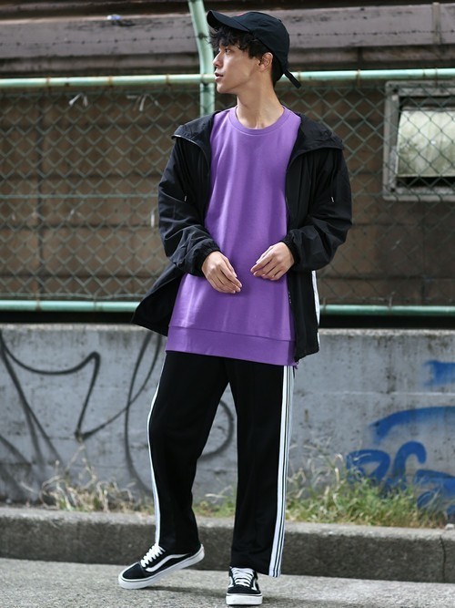 こちらは、トレーナー×ウインドブレーカー×ジャージパンツ×スニーカーを組み合わせた、ランニングにも最適なリラックスコーデ。黒と白のモノトーンカラーが爽やかです。パープルのトレーナーが加わることで、全体のコーデにアクセントがプラスされておしゃれな印象になっていますね。トレーナーの裾はルーズに着こなして、イマドキ感を添えています。