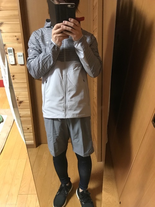 ハーフパンツの下には、ロングタイツを合わせて寒さ対策も万全。さらに、撥水性のあるウインドブレーカーを取り入れているので、急な雨も安心ですね。おしゃれも機能性も両方取り入れたランニングコーデです。