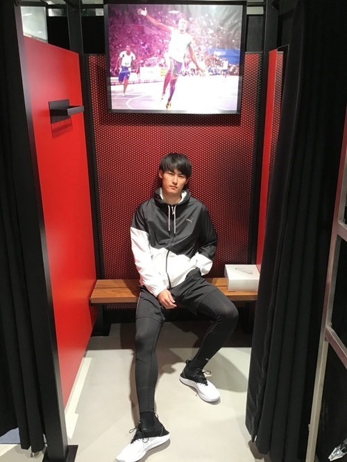こちらもウインドブレーカー×ハーフパンツ×ロングタイツ×スニーカーを組み合わせたコーデ。上下ともにPUMAのブランドアイテムで統一しています。
