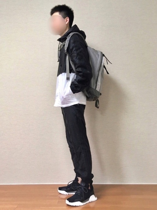ウインドブレーカー×パンツ×リュック×スニーカーのこちらのコーデは、白と黒でモノトーンを意識したスタイル。ウインドブレーカーの配色も絶妙で、コーデの良いアクセントになっています。adidasのブランドアイテムをふんだんに取り入れた、統一感のある着こなしがかっこいいランニングコーデです。