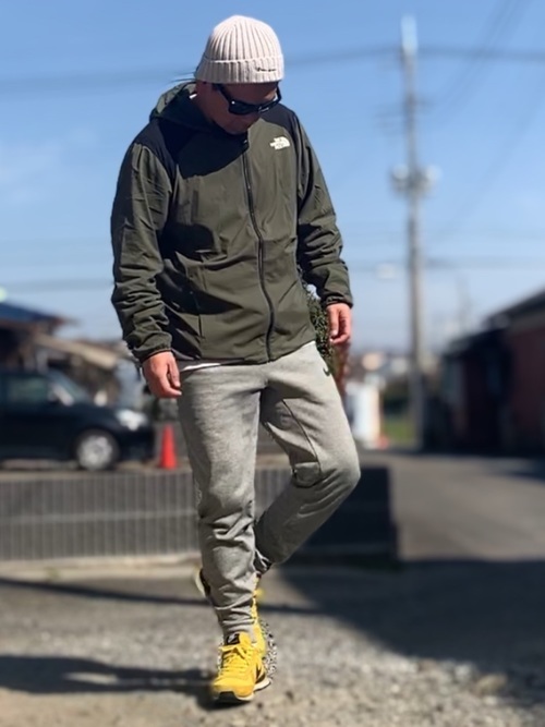 全身を「THE NORTH FACE」のアイテムで揃えて統一感を演出。カーキ×グレー×ブラックのカラーバランスも絶妙ですね。春先でも冬でも万能に着こなせる大人かっこいいコーデになっています。