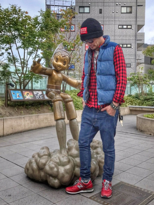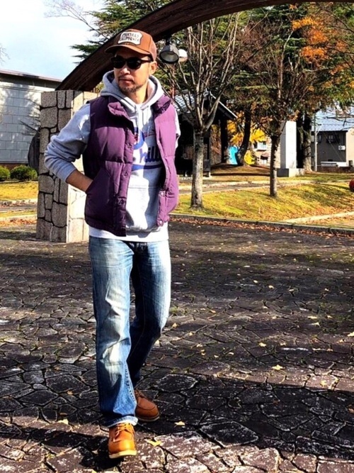 ニットキャップ・アウターのデニムダウンベスト・ボトムスのジーンズをブルー系、インナーのネルシャツと足元のスニーカー赤系にするという組み合わせで、全体的にバランス良く仕上がっています。シンプルな着こなし方ですが、カラーコーディネートが絶妙なメンズコーデだと言えるでしょう。