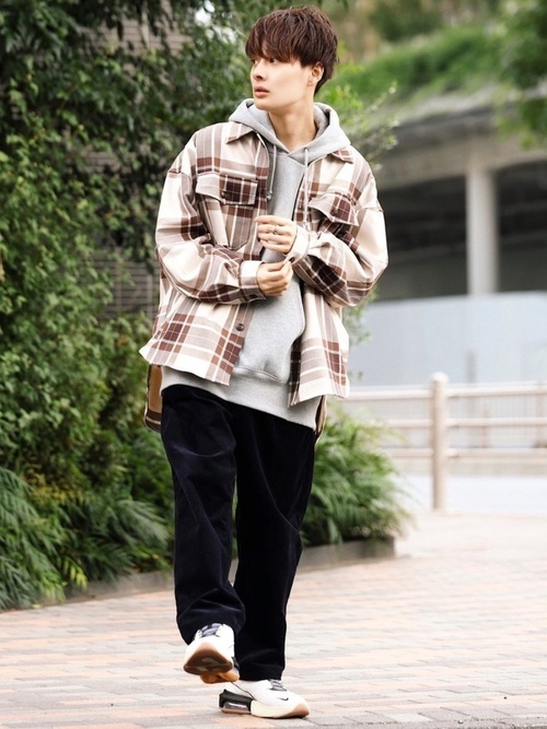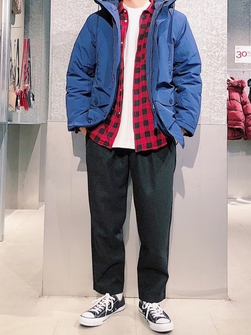 青のマウンテンパーカーの中に着ている赤のチェックシャツが、いい差し色になってますね。ゆったりとしたシルエットのパンツと足元のスニーカーがカジュアル感を引き立たせていて、とてもおしゃれですよ。