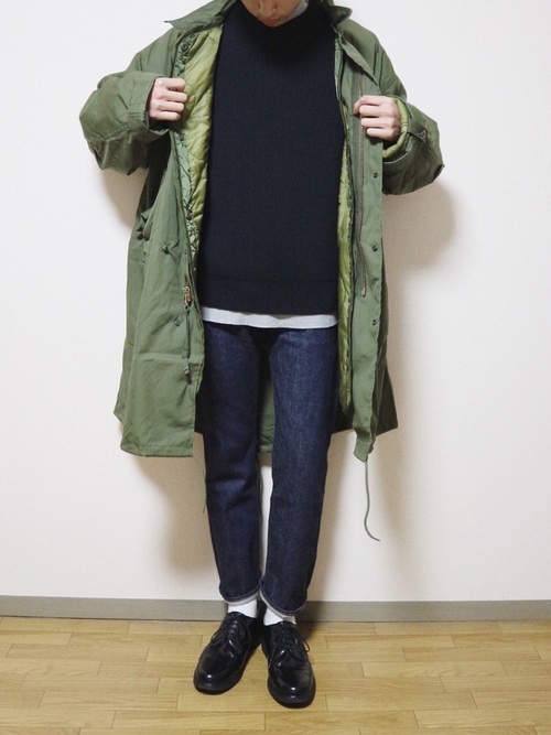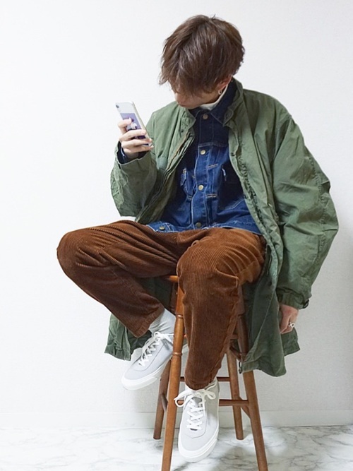 モッズコート×デニムジャケット×パンツ×スニーカー