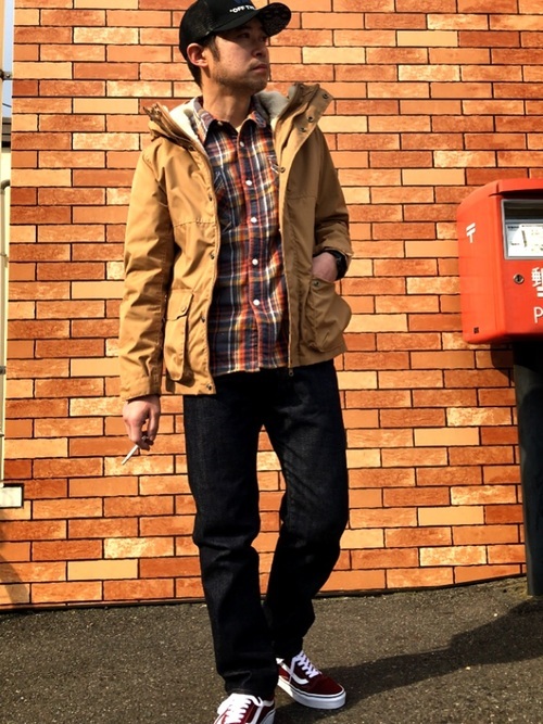 キャップ×マウンテンパーカー×ネルシャツ×ジーンズ×スニーカー