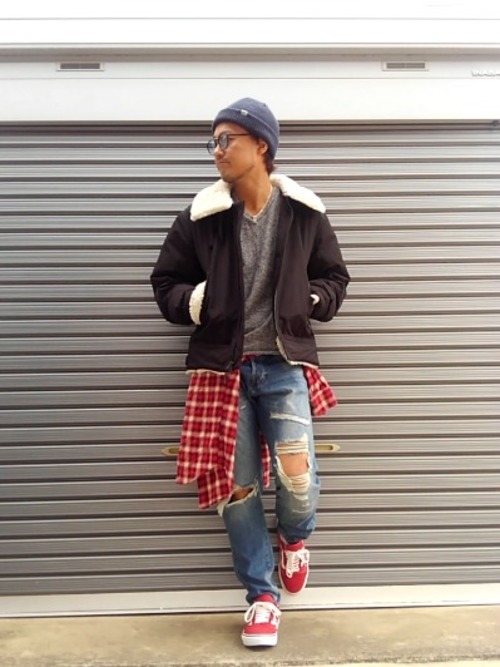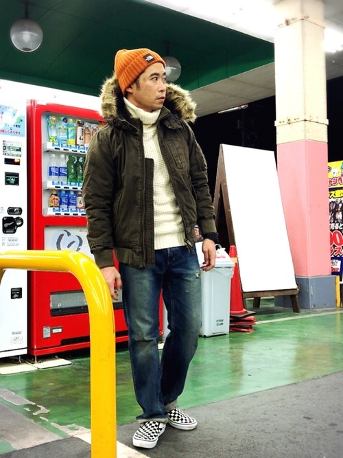 ニットキャップと足元のVANS製スリッポンが、アメカジ感を上手く演出しているポイントですね。ファー付きのフードがあるミリタリージャケットはとても防寒性が高いので、こちらのコーデのようにインナーは薄手のニットだけで十分です。重ね着しすぎてモコモコにならないよう、注意しましょう。