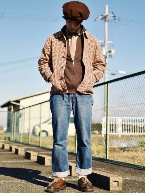 こちらは古着を上手く取り入れたメンズコーデになります。足元のスニーカーを白にすることで、清潔感のあるコーデに仕上がってますね。着こなし方自体はシンプルですが、見事なカラーコーディネートで全体的に上品な仕上がりになっているのがわかります。