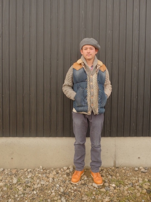 ロッキーマウンテン製のダウンベストにカーディガンとハンチングを合わせて、カジュアルな中にも大人っぽい雰囲気をかもしだしていますね。ボトムスをジーンズではなく厚地のパンツにしたところが、周りと差をつける個性的な着こなし方のポイントではないでしょうか。