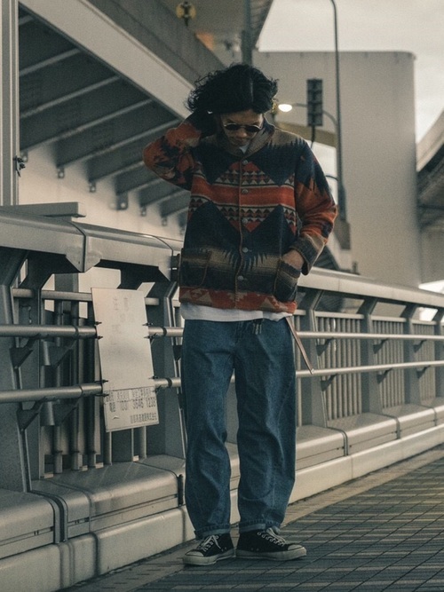 ネイティブインディアンを彷彿させるようなニットジャケットがインパクト満点です。このアウターにゆったりシルエットのデニムパンツという組み合わせが、シンプルな着こなし方にもかかわらずとてもおしゃれです。足元をスニーカーからブーツに変えてみるのもアリですよ。