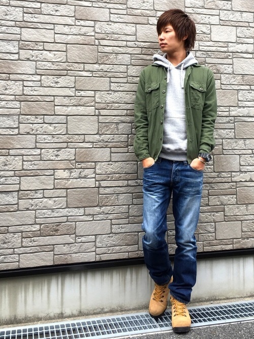 アウターのミリタリージャケットの中にデニムジャケットを合わせるという、いわゆる“ジャケット・オン・ジャケット”という着こなし方がこちらのコーデのポイントです。アウターを普段より1サイズ大きめにすれば、重ね着しても見た目がモコモコにならないので試してみてください。