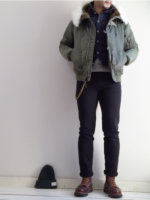 ニットキャップ×ミリタリージャケット×デニムジャケット×パンツ×ブーツ