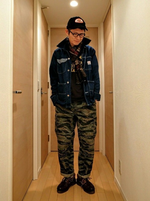 ミリタリー感溢れるカーゴパンツにデニムのカバーオールの組み合わせが、上手くアメカジ感を演出した着こなしになってます。首元のショールやキャップといった、小物を上手に取り入れたメンズコーデだと言えるでしょう。