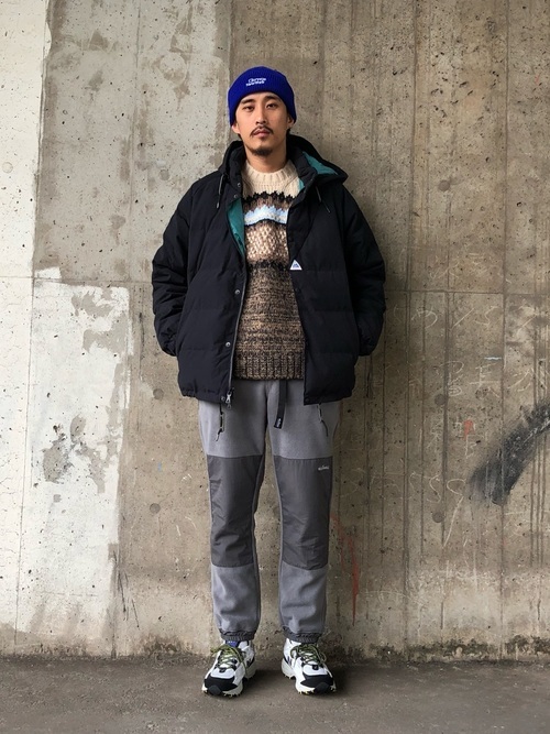 冬の定番であるアイリッシュ柄のニットと黒のダウンを合わせました。ジョガーパンツで足元がすっきり見えるので、ダウンのボリューム感とのバランスも良くなります。防寒対策もばっちりなので、街着にはもちろんアウトドアにも使えるタウンユースなおしゃれコーデです。