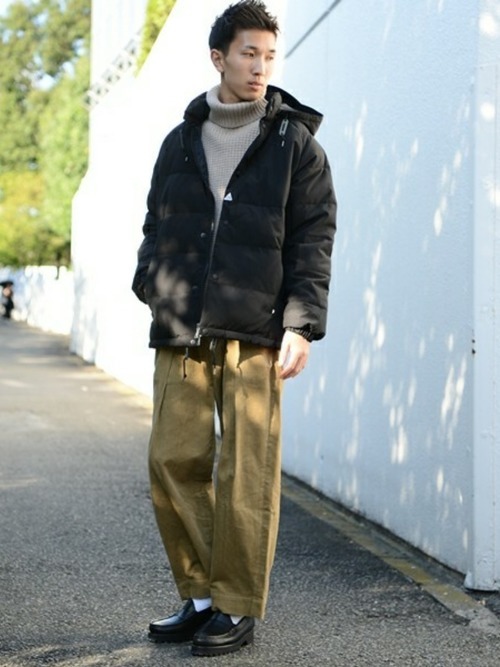 エレガントで大人っぽい印象のタートルネックに黒ダウンを合わせました。ケープハイツのダウンは、ボリューム感はあるものの細身で着ぶくれしません。ワイドパンツと合わせてもクールでスッキリとしたシルエットになるので野暮ったさがなく、おしゃれ好きなメンズには嬉しいですね。