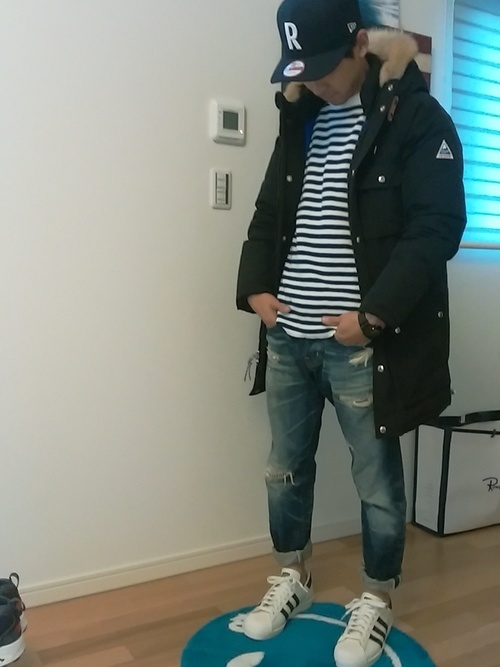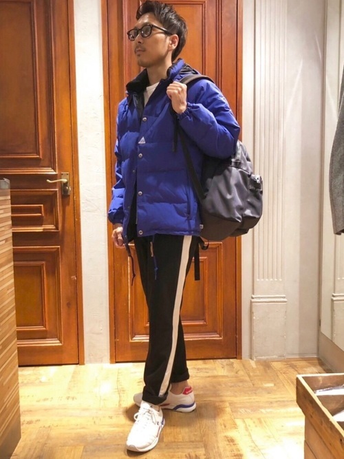 ブルーのダウンにラインパンツを合わせたスポーティコーデです。鮮やかなブルーで冬の憂鬱な気分も吹き飛びますね。おしゃれなカラーレンズメガネを合わせればストリートカジュアルの中にも大人の色気が漂います。