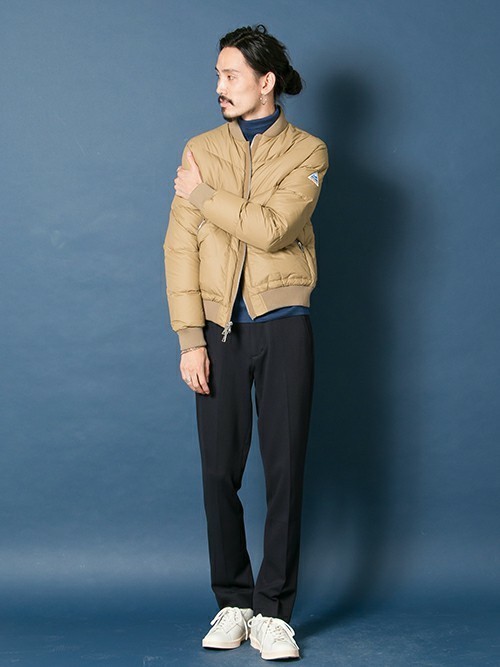 ベージュのダウンブルゾンに大人カジュアルなスタイルを合わせました。タートルネックのニットと黒のパンツは、ビジネスシーンでも使用できる、無駄をなくしたシンプルなデザインです。ダウンブルゾンで外して、カジュアルなのに上品さも漂う大人おしゃれコーデです。