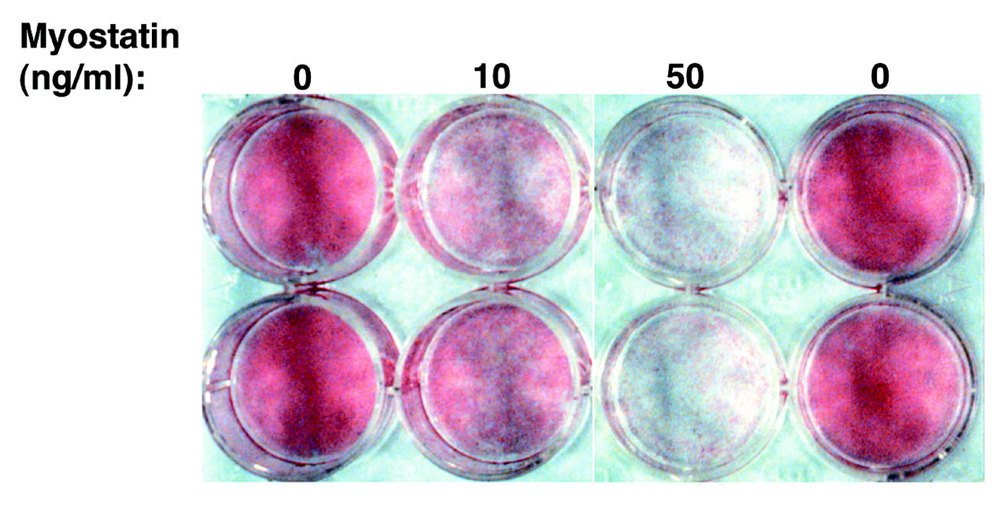 筋繊維の周りには筋サテライト細胞という細胞が存在し、これが分裂して増殖することで筋肉が発達します。ミオスタチンにはその分裂・増殖を抑制する働きがあります。通常はその抑制が程よく機能して筋肉の異常発達に繋がることはありません。何らかの原因でこの抑制の働きが過度に阻害されると筋肉肥大が進み過ぎ、ミオスタチン関連筋肉肥大に繋がります。