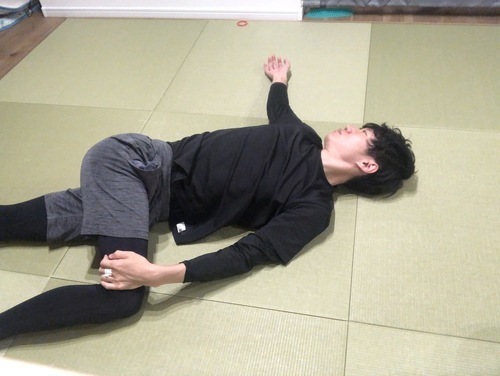 ①床で仰向けになり、両腕を左右に伸ばして床につける