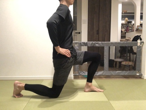 腸腰筋に効かせるストレッチです。腸腰筋は前傾したり屈曲する働きがあるので、脚を付け根から伸ばすことでしっかり伸ばして解すことができます。