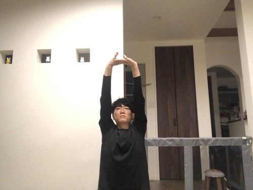 ゆっくり10秒ほどかけて腕を上に上げて身体を伸ばし、その後さらに身体を伸ばして10秒ほどキープします。5セットほど繰り返すと良いでしょう。