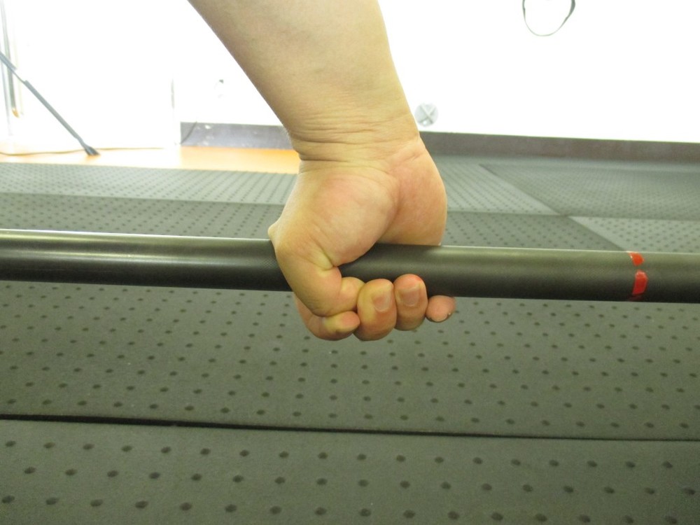 「フックグリップ」とは、持ち方は「オーバーハンドグリップ」と同じ両手の甲を上に向けて握る握り方ですが、親指の上に人差し指と中指を乗せ、親指を隠すもち方です。人差し指と中指を引っ掛けることで「オーバーハンドグリップ」より高重量を扱いやすいです。