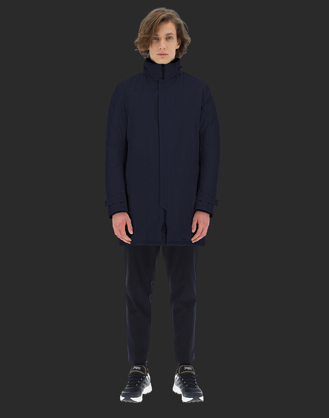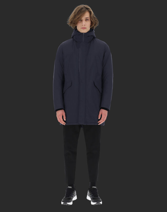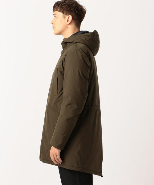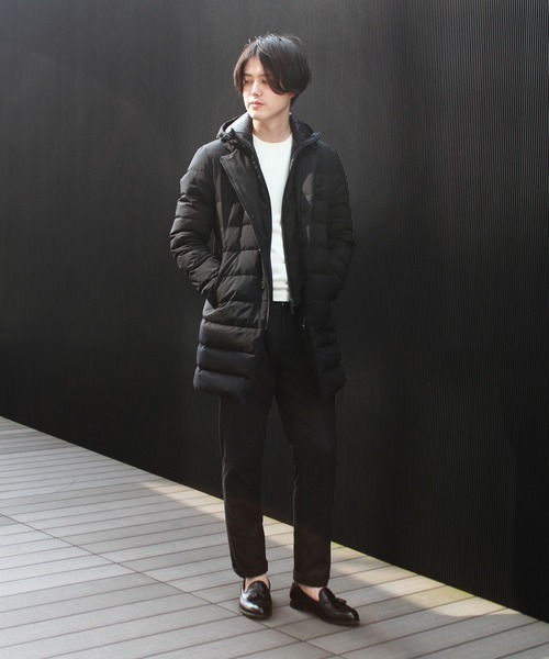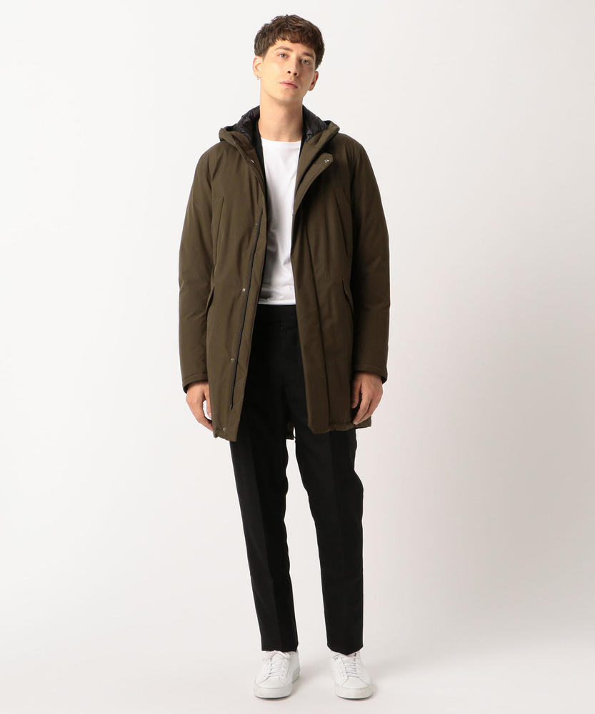 こちらはダウントレンチコートと同じく、二重構造のゴアテックスを使用した2レイヤーコートです。すっきりとしたシンプルなデザインの中に、折り畳み式のフードやリブ素材のインナーカフスが隠れており、機能面にも優れたモデル。外回りが多いビジネスマンやダウン特有のステッチやボリューム感が苦手という方にぜひおすすめしたいダウンです。